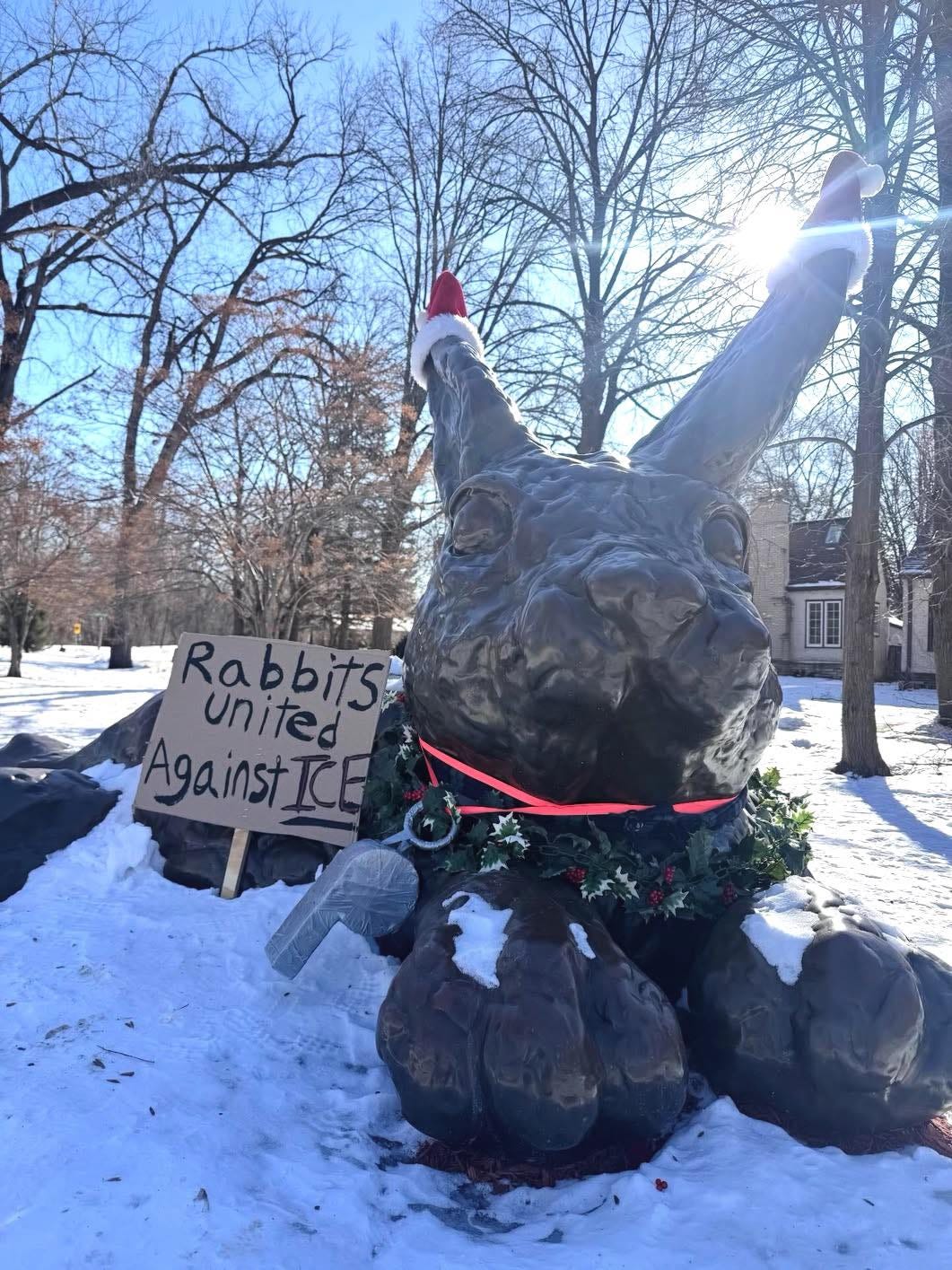 While Spoonbridge and Cherry is the piece of sculpture most associated with Minneapolis, my favorite sculpture is the Minnehaha Bunny at the corner of Portland and Minnehaha Parkway, where I walk with my dogs most days. We decorate him for every holiday and in response to current events (and when I say “we,” I mean people unknown to me who have taken it upon themselves to do this, which is the kind of energy that’s driving the whole of Minnesota right now). Anyway, I have never loved the Minnehaha Bunny more than I love him now.