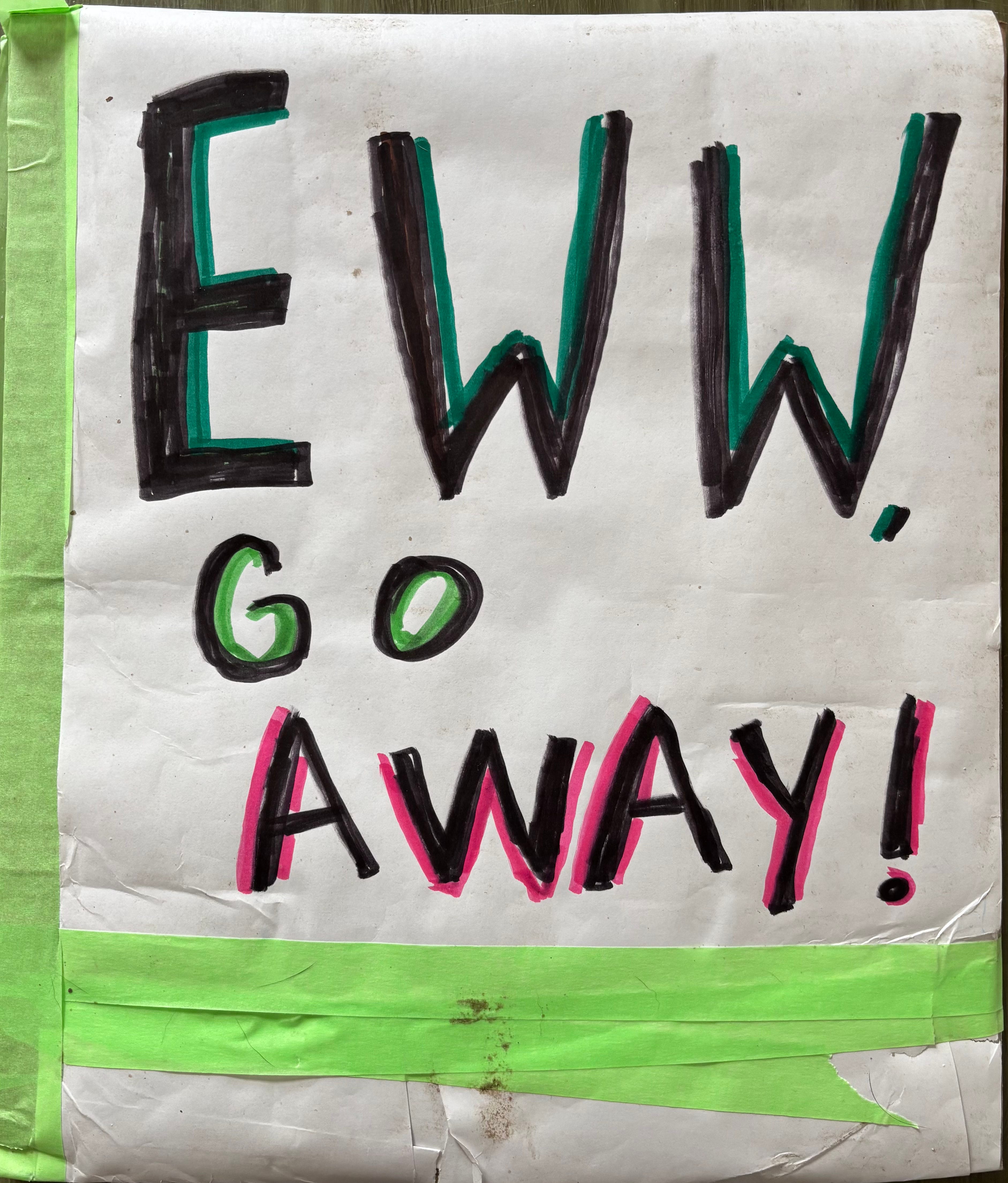 ICE has been up and down our street several times that I’m aware of, but it’s nothing like we’d be experiencing if we lived ten blocks north or east of here. At one end of my block is an elementary school, and at the other, a children’s music school. On the day of the first big protest downtown, the -10° before windchill day, we noticed our street filling up with cars. Bundled-up parents and children carrying signs were making their way down to the music school. I grabbed my sign and joined them. The woman who owns the music school was leading the children in age-appropriate chanting and stomping (the latter primarily intended to keep them moving in the cold). Some of the parents joined in, too, but, clearly, this was the kids’ opportunity to protest. School-aged children in the Twin Cities have been powerfully affected by the federal intrusion; schools have been particular targets. My friend Beth Hawkins writes about it here. The parents were mostly focused on patrolling the perimeter and steering the kids who got too cold towards one of the braziers that had been lit in the courtyard. After the protest, I found a sign on the street in front of my house.